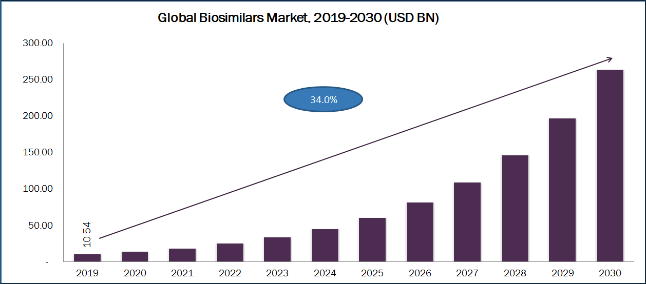 The Global Biosimilars Market size is estimated to be USD 10.54 billion in 2019 and is predicted to reach USD 263.57 billion by 2030 with a CAGR of 34.0% from 2020-2030. Biosimilars are exactly what its name implies. These are biologics that are similar to other biologic drug that is already present in the market. Any differences between the reference drug and the biosimilars can impact the quality, safety and efficacy of the medicine. As generic medicines are synthesized to make identical to the reference medicine, biosimilars cannot be synthesized in that way due to their complexities. Hence, the process of manufacturing generic medicines cannot be applied in manufacturing biosimilars.